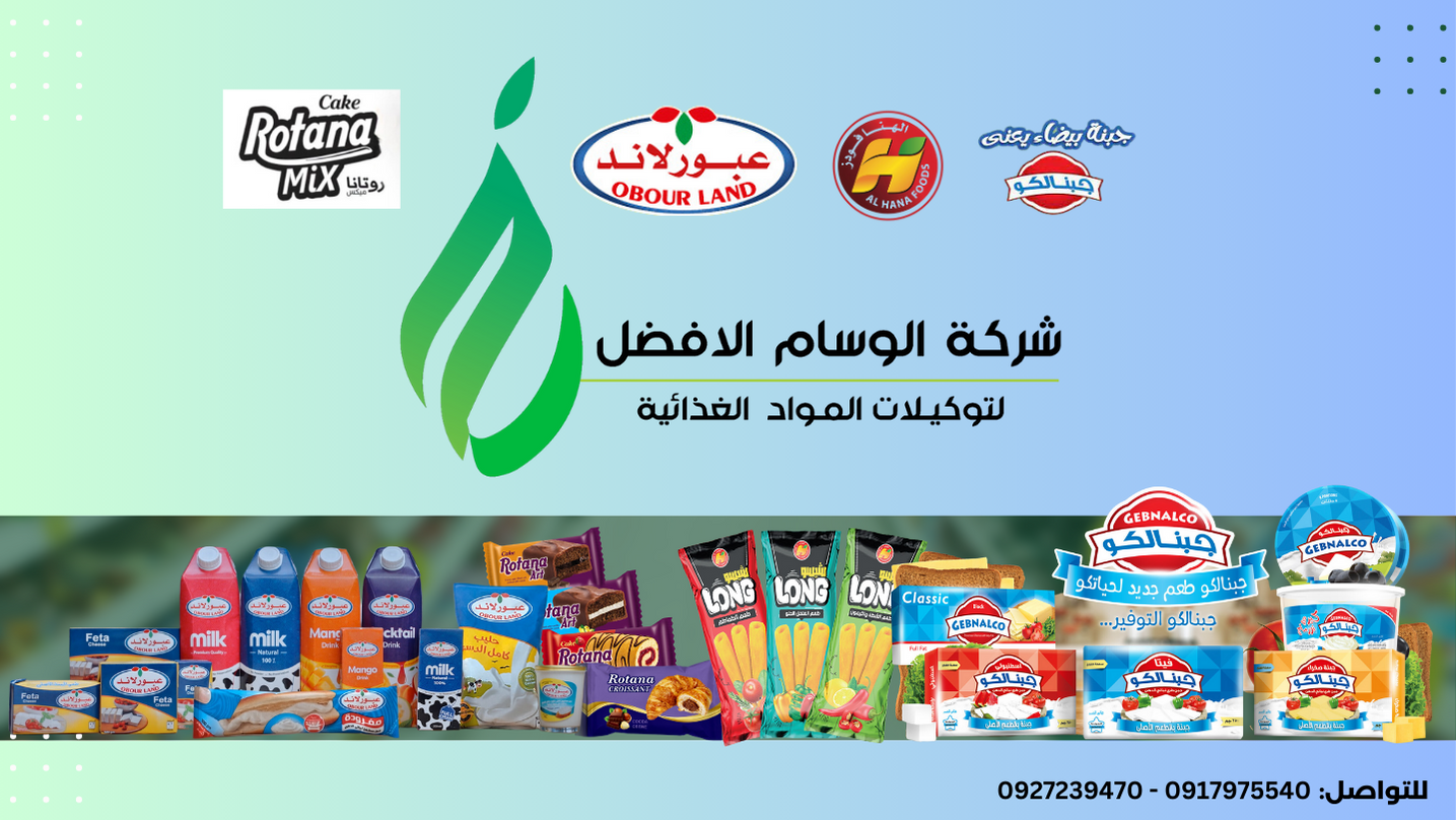 شركة الوسام الأفضل للتوكيلات الغذائية هي شركة ليبية متخصصة في استيراد وتوزيع المواد الغذائية بجودة عالية. نوفّر منتجات مختارة بعناية من أجبان، عصائر، ومستلزمات غذائية متنوعة، ونمثل الوكيل الحصري لعدد من العلامات التجارية الموثوقة في السوق الليبي